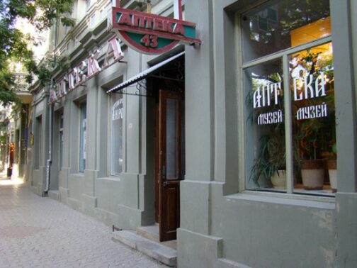 Первая аптека в городе Евпатории была открыта в далеком 1823 году. До сегодняшнего времени в здании в целости и сохранности стоят старинные аптечные витрины, мебель, ветхая, но, тем не менее, прекрасно сохранившаяся, а также другой фармацевтический инвентарь: весы, колбочки с ингредиентами, ценники на лекарственные препараты и другие специфические предметы. Самые небольшие размером музейно-аптечные экспонаты располагаются на деревянных стеллажах, которые также были построены и установлены старым первым фармацевтом. Также на них стоят в своем определенном порядке аптечные точные весы, ступки для измельчения лекарств, стеклянные баночки, где находились ранее препараты и аптечные лекарственные порошки. Здесь можно найти первую самую настоящую аптечную рекламу, и подобие сегодняшних прайсов на лекарства, которые были действительны в те времена. Здесь же на полке стоит фотография семьи первого фармацевта, работавшего в этой аптеке. Сохранилась и важная документация, которая является официальным подтверждением купли и продаже данного здания аптеки Роффе.