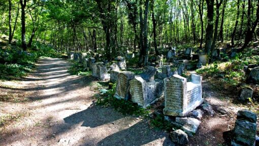 Караимы — древний тюрскский народ, исповедующий иудаизм, непохожий на современные иудейские верования. В отличие от христиан, мусульман и других иудеев, караимы хоронили своих умерших в направлении север-юг. По разным данным, некрополь у Чуфут-Кале начал существовать в VI — XIII веках. До сегодняшнего времени многие надгробия уже давно разрушились и превратились в прах, на некоторых совершенно стерлись надписи, а другие еще сохранили на себе следы прошлого.