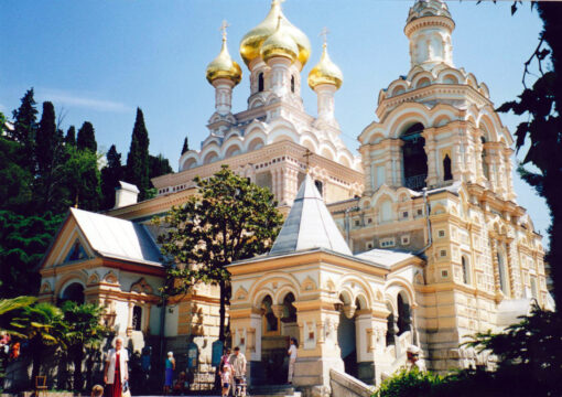 Если вы оказались в Ялте, вам стоит посетить Собор Святого Александра Невского. Храм заложили в 1891 году, как дань памяти императору Александру II Освободителю. Кроме того, считалось, что Александр Невский покровительствует дому Романовых, поэтому храмы в его честь строились по всей Российской Империи. Проект, утвержденный лично Александром III, был разработан архитекторами Н.П.Красновым и П.К.Теребеневым. Собор был освящен в 1902 году в присутствии Николая II. Архитектура выполнена в неорусском стиле: бело-розовый храм украшен множеством декоративных элементов: киотцами, пилястрами, шатровым кольцом. Позолоченные купола, иконостас и стены расписаны киевским мастером И.Мурашко. Собор состоит из двух ярусов: нижний храм освящен в честь Святого Великомученика Артемия, а нижний – в память Святого князя Александра Невского.